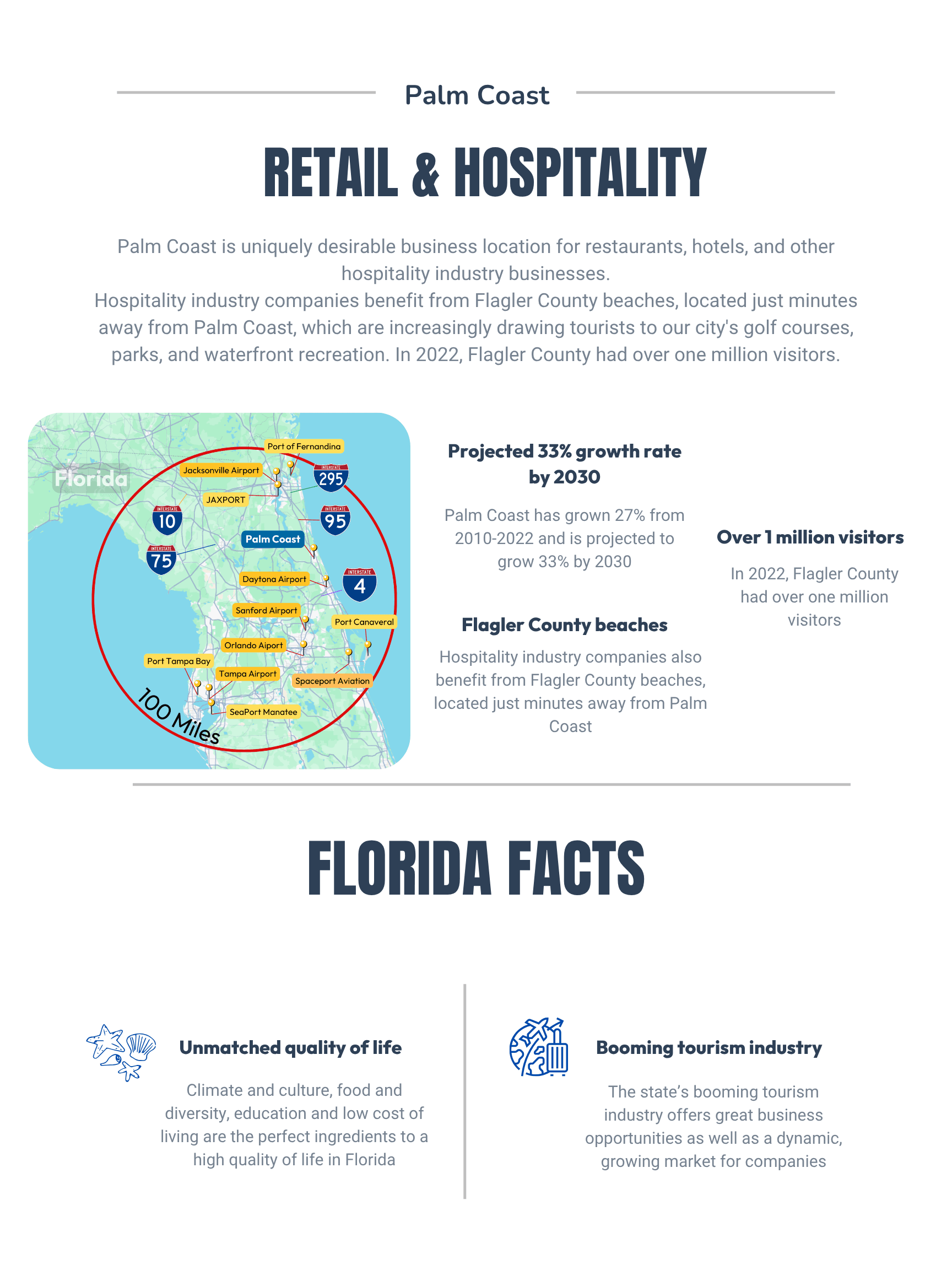 The city is one of the fastest-growing counties in one of the nation's fastest-growing states. offering access to attractive and sustainable consumer markets. Hospitality industry companies also benefit from Flagler County beaches, located just minutes away from Palm Coast, which are increasingly drawing tourists to our city's golf courses, parks, and waterfront recreation. The city is the 9th fastest growing city in Florida. In 2022, Flagler County had over one million visitors.
