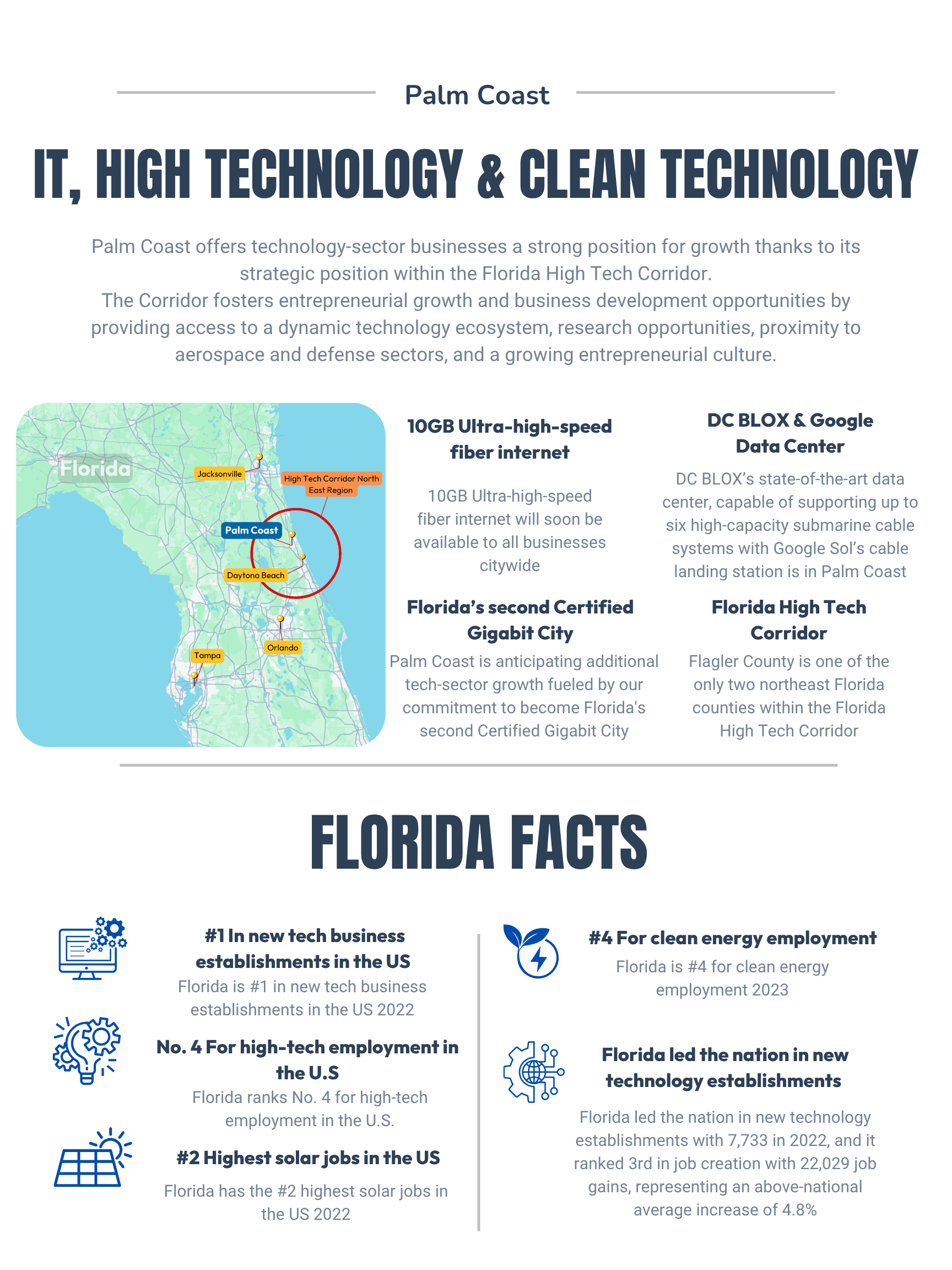 Palm Coast offers technology-sector businesses a strong position for growth thanks to its strategic position within the Florida High Tech Corridor.